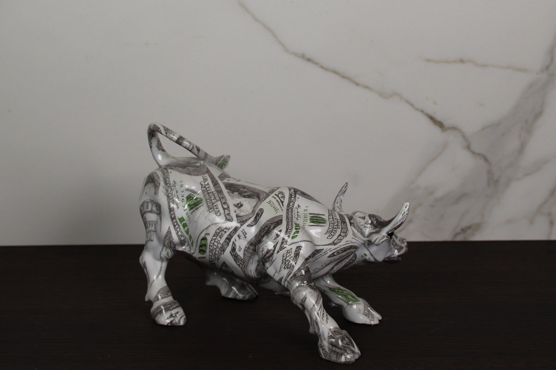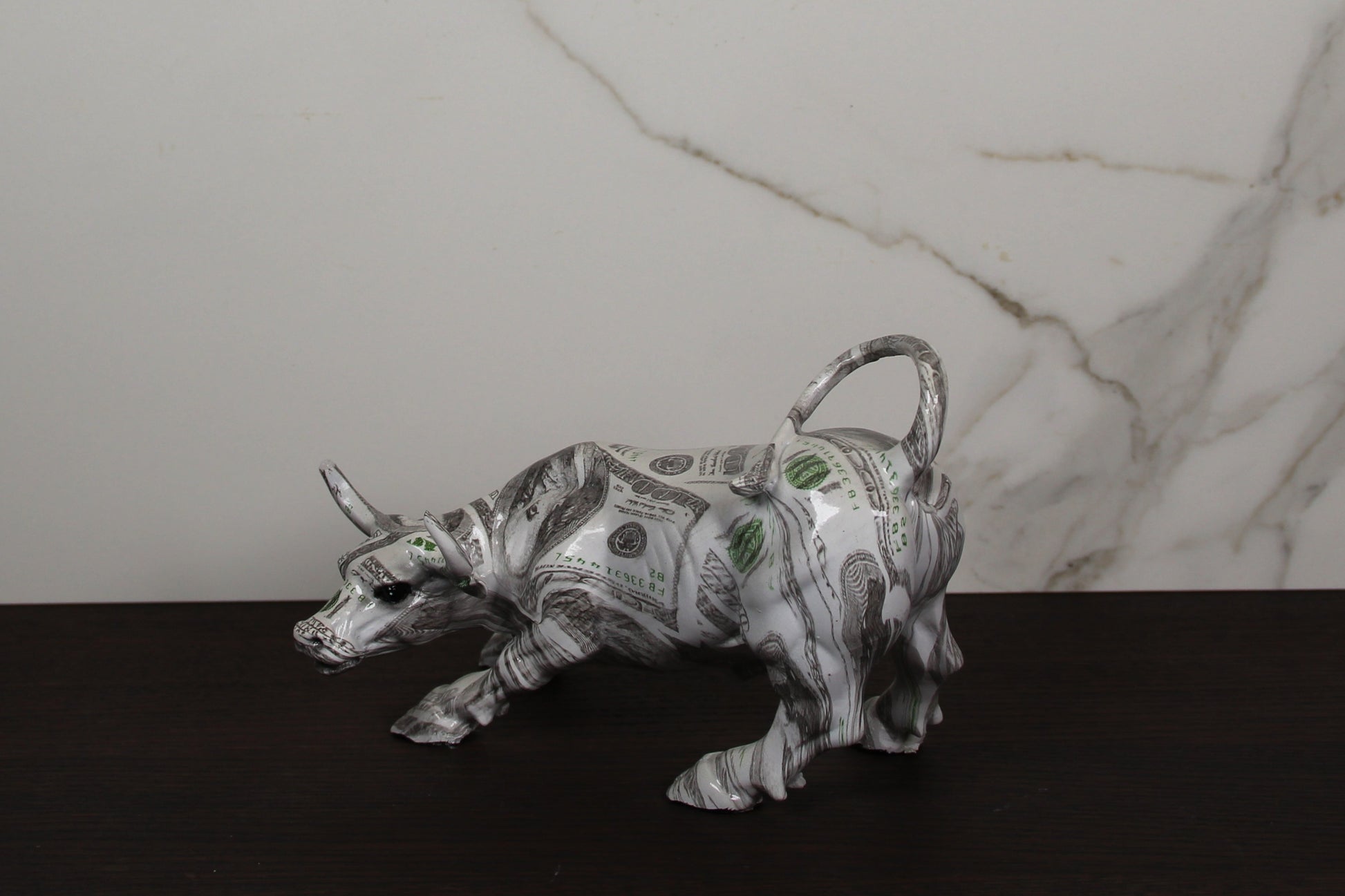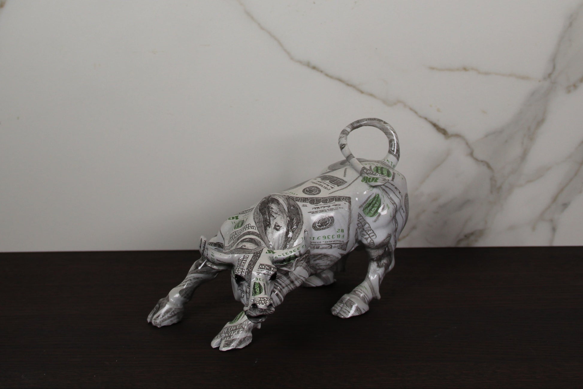 Each Money Bull sculpture is carefully handcrafted from durable polyresin and finished in a striking money pattern. Because it is individually hand-painted, no two bulls are exactly alike, making each piece truly unique.